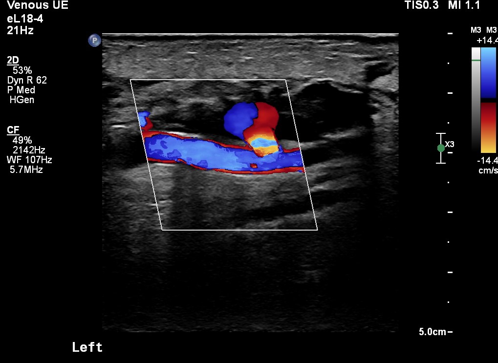 Figure 1 - Demonstrated a cystic structure with low level echoes in the left antecubital fossa, directly under the site of the left brachial artery angiography puncture site.