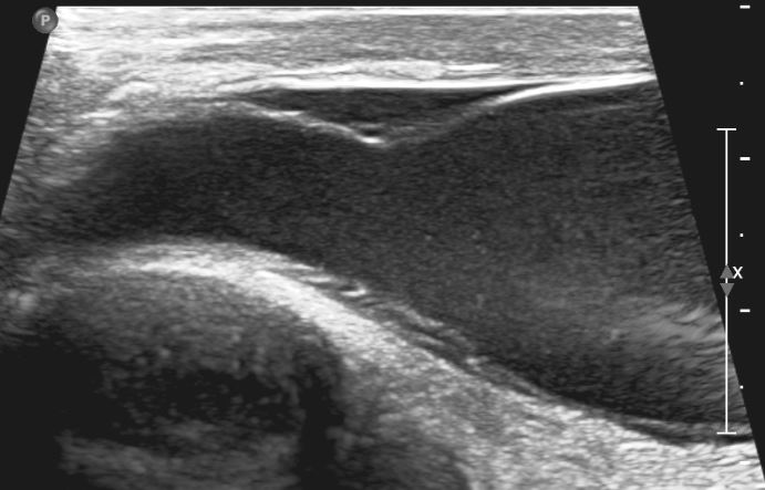 Figure 2 Low level echogenic fluid seen within the tunica vaginalis of the right hemiscrotum seen extending proximally into the right inguinal canal |