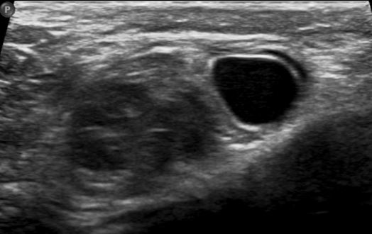 B-mode ultrasound demonstrated fluid within the tunica vaginalis of the right hemiscrotum which contained low level echogenic debris. This fluid could be seen extending superiorly into the distal aspect of the right inguinal canal (fig1).
