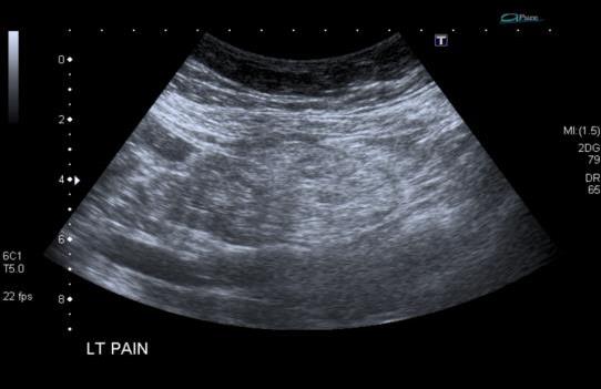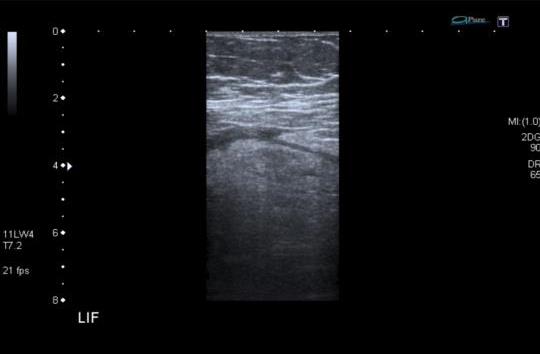 A 61-year-old female patient was referred for an abdominal ultrasound to investigate 3 day history of left iliac fossa pain. On further assessment, the pain was described as being intermittent and exacerbated by movement. There were no urinary symptoms and no change in bowel habits. The patient was otherwise fit and well and had a previous cholecystectomy.