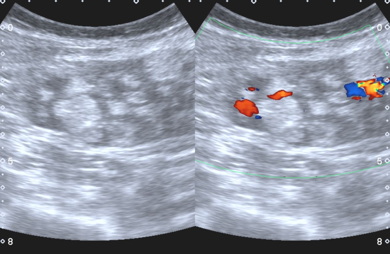 A 45 year old female patient was referred by her GP for a renal ultrasound to investigate hypertension resistant to drug treatment. She was otherwise in good health and had no previous medical history of note or relevant family history. Representative ultrasound images of the kidneys are shown in Figures 1 and 2.