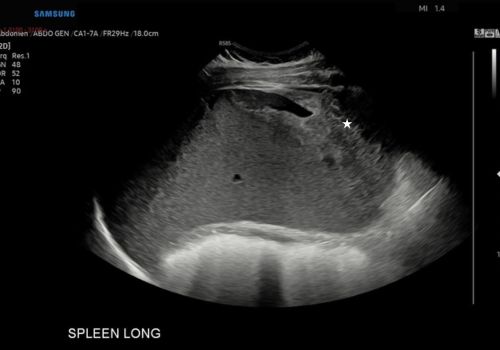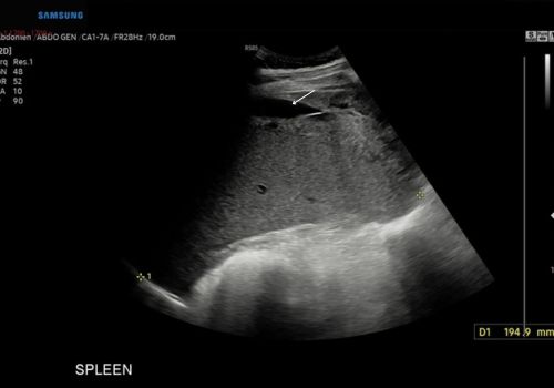 B Mode ultrasound findings confirmed hepatosplenomegaly along with a small volume of free fluid.