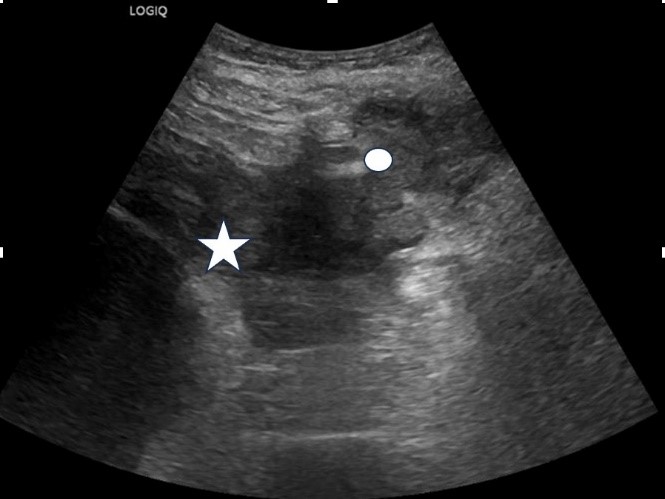 | Figure 2: Lower pole of the left kidney with the abscess seen extending into the extrarenal space (Star: Lower pole of the left kidney, Circle: Sinus tract) |