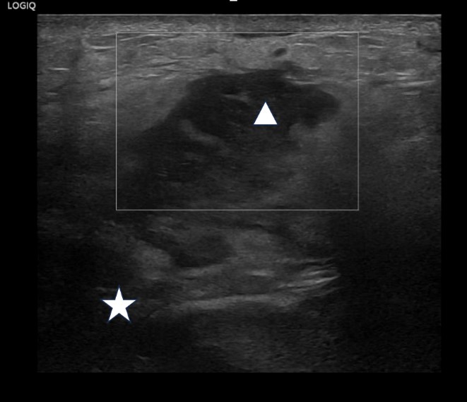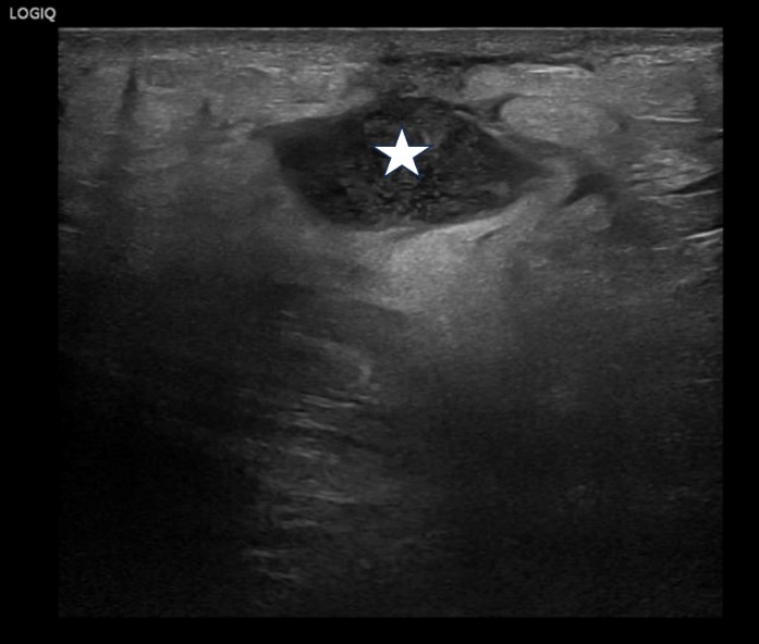 | Figure 4: High resolution linear probe image of the palpable lump demonstrating pyogenic content with low level echogenic debris (Star: Collection with in the subcutaneous tissues) |