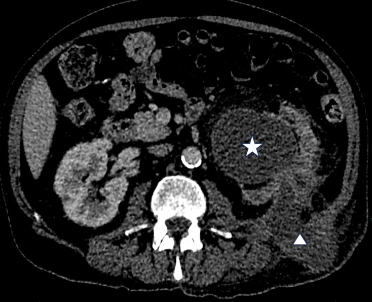 | Figure 3: Sinus tract extending from the left kidney through the posterior abdominal fascial planes (Star: Intraperitoneal aspect of the sinus tract, Triangle: Subcutaneous aspect of the sinus tract) |